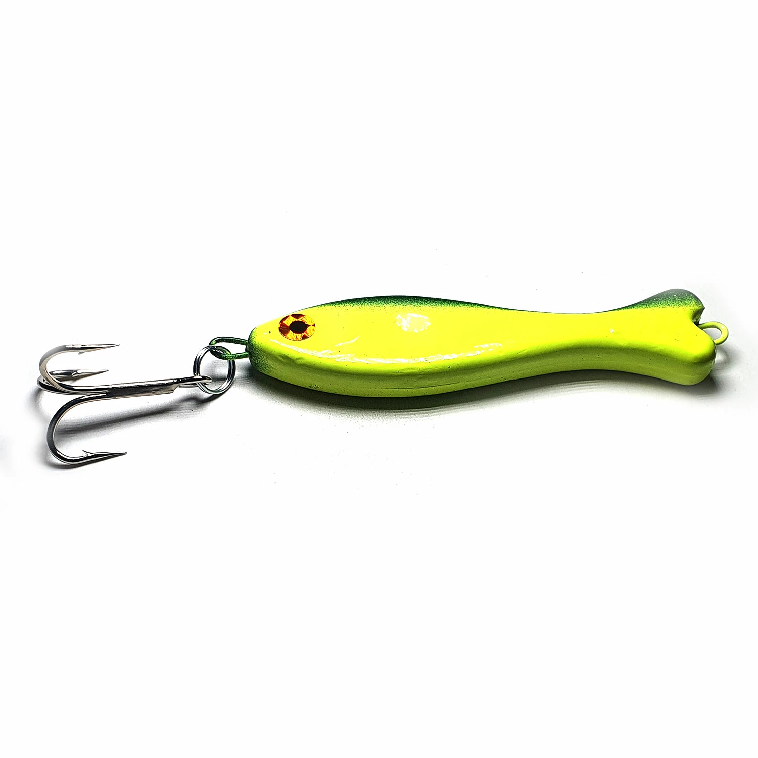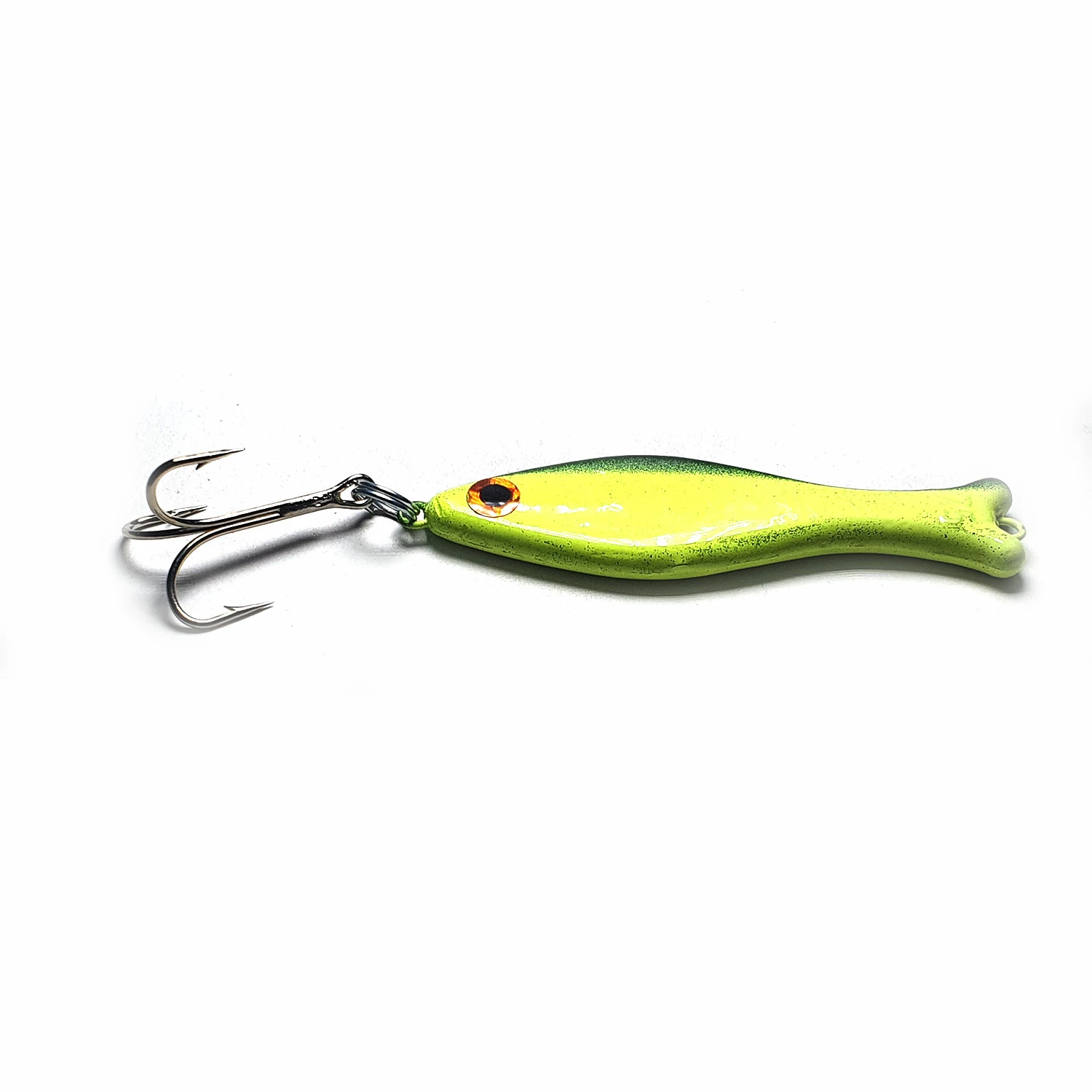The Sema Baitz Pirk in Yellow and Dark Green is a Jigging Pirk, ideal for fishing off the side of a boat. These Lures range in size from the small 30g all the way to the large, deep-sea 400g version. Every one of these Lures comes with a chemically sharpened treble hook, excellent for that mu