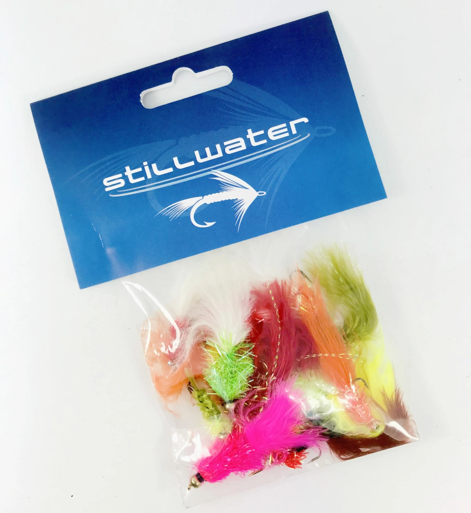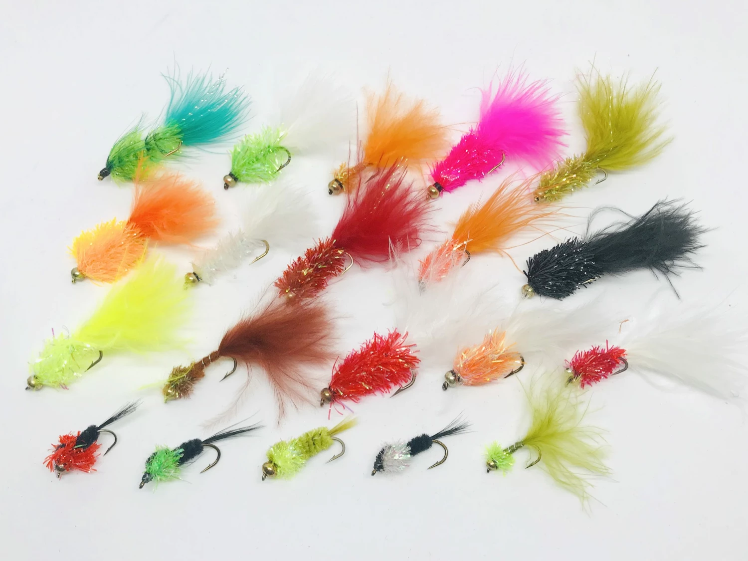 Fritz Trout Fishing Flies in a range of colours and variations, trout are attracted to the sparkle they create in the water. This is a smashing assortment of colours and sizes. Tied with good quality hooks and materials.