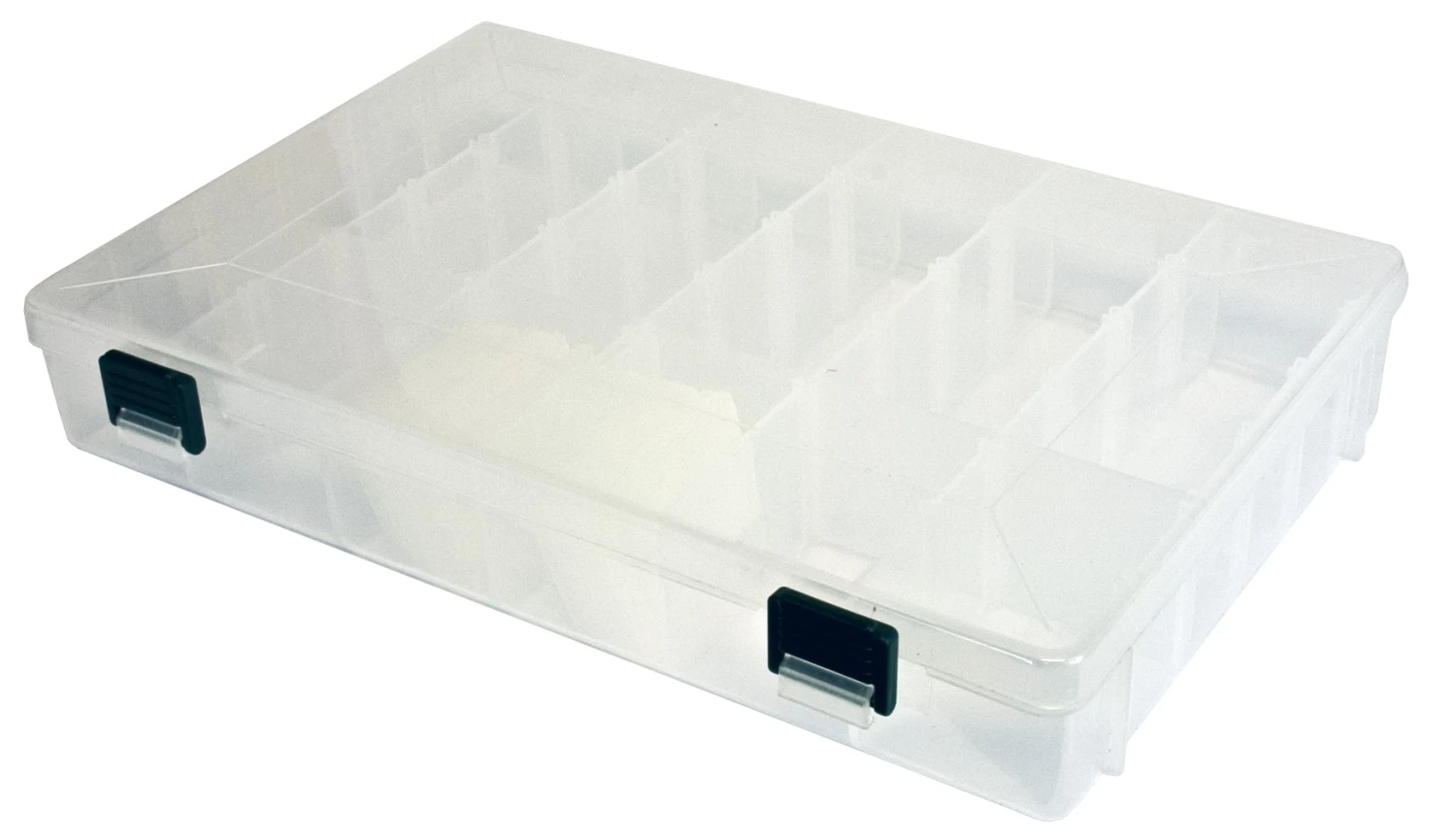 A large clear lure/tackle Box featuring 36 Compartments all with removable dividers, waterproof, hinged, rust proof and almost unbreakable.