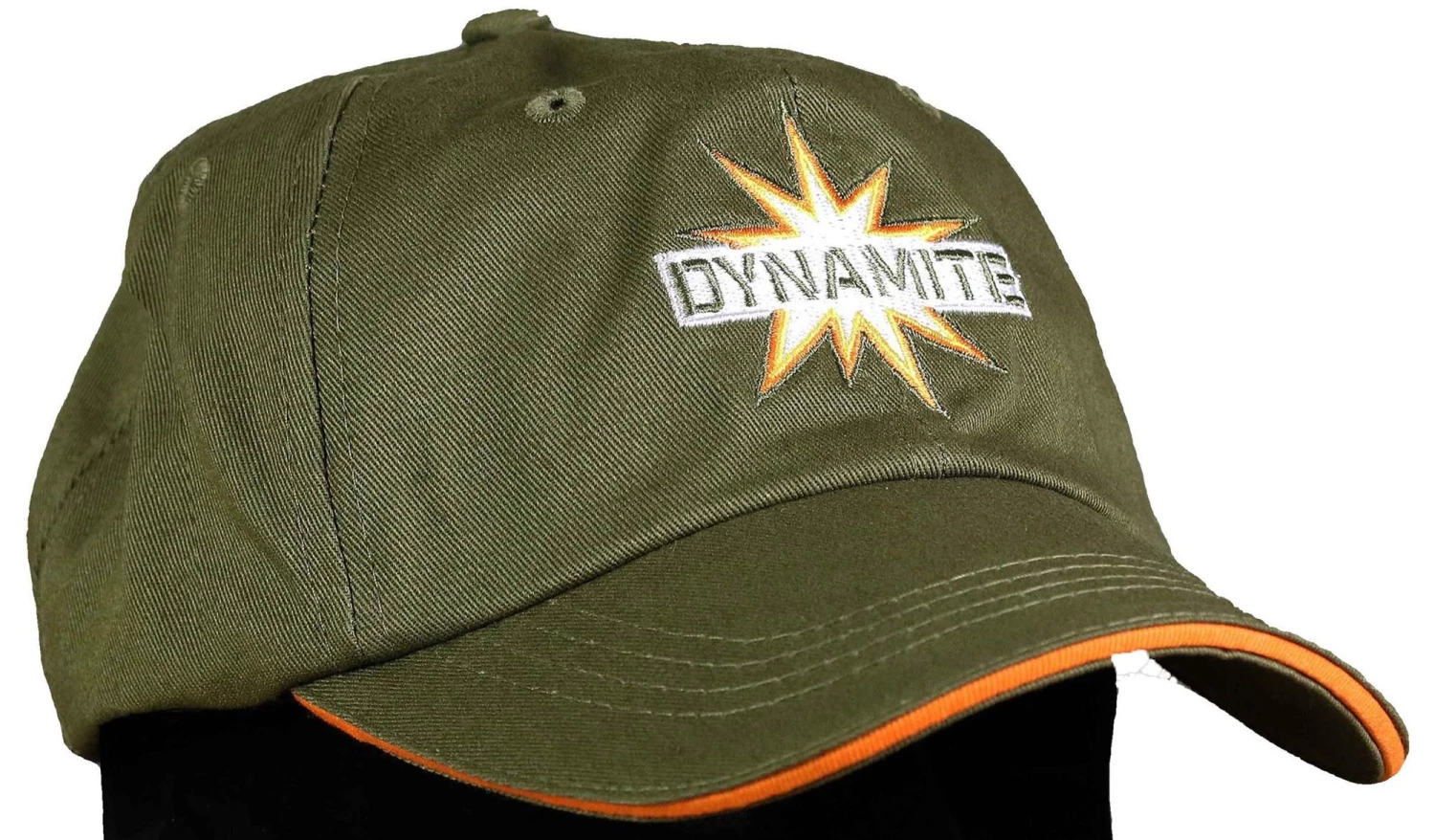 Olive green baseball cap with contrasting orange trim in peak. Front embroidered Dynamite logo with small web address embroidered to rear. Cap has elasticated inner-rim and metal-buckle size adjuster.