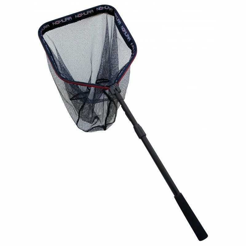 Nomura Special landing nets for spinning, with telescopic aluminum handle and rubber insert, silicone net, flat bottom and snap closure.