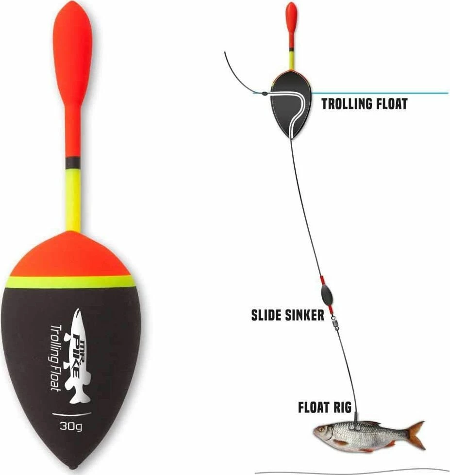 A must for every seasoned pike angler – the Mr. Pike ‘Trolling Float’ This ideal trolling float for deadbaiting behind a boat is equipped with an integrated self-clamping device that prevents the main line from running through the float when pull is applied. This ensures that the baitfish always remains at the depth pre-determined by the angler and does not wander upwards through the line stopper. Produced from indestructible Rohacell – made in Germany