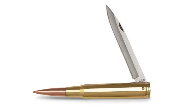 The 50 Cal. Bullet Folding Knife from United Cutlery is constructed to be the same as the actual .50 caliber bullet. It features a 4″ satin finish AUS-6 stainless steel spear point blade with a beautifully polished solid brass case and copper-plated bullet on the tip.