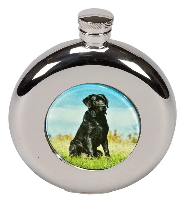 Captive top. Stainless steel flask with a round motif of a Black Labrador scene. Comes with a presentation box which includes a funnel.