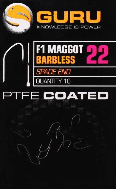 Spade end, PTFE coated super sharp barbless hooks specially suited to F1 maggot fishing but can also turn their hand to a variety of baits & venues.