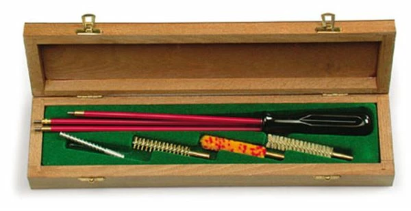 Rifle cleaning kit supplied with wooden box for storage. This kit includes a 3 piece plastic coated rod with full set of brush heads – wool, nylon and brass. An aluminium jag is also included for additional cleaning methods.