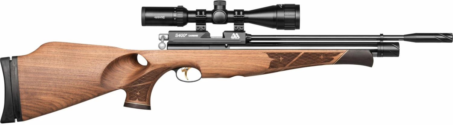 The Air Arms S400 Carbine is the most popular top class, single-shot, pre-charged pneumatic sporter of them all and for a host of good reasons. Developed and built with the same care and precision as its 10-shot stablemate, the S400 is as comfortable in the hunting field as it is on the Hunter Field Target course.