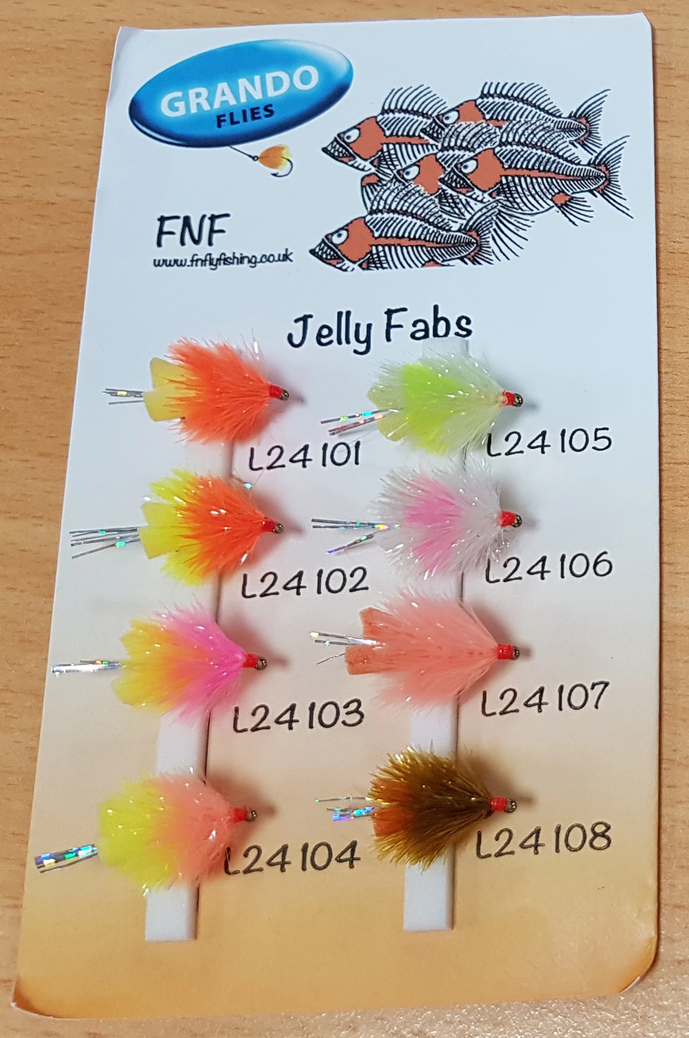 These Jelly Fabs use translucent Jelly Fritz from FNF which has taken still-water fishing by storm. These are the patterns we have found most successful and include a variety of bright and subtle colour combinations. The foam tied in the tail gives just enough buoyancy to support a team of nymphs using a washing line method. They are tied on super sharp wide gape hooks to meet competition rules. Look out for other selections using the latest FNF materials.