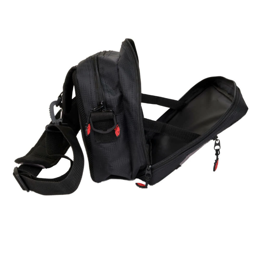 A versatile, neat and compact bag ideal if you’re a mobile lure angler. Designed to store lure boxes, line, terminal tackle and any other tackle you might need for a session, all handy and easy to get to. Made from durable, water-resistant and wipe clean 420D Oxford Nylon material, this bag is designed with practicality in mind. It can be worn like a sling bag over your shoulder or converted into a waist bag by attaching the padded strap to the differently positioned D rings around the bag. The strap has a spare D ring for attaching tools and also has MOLLE style webbing straps for attaching other close to hand items. To the side, there is a fold that can be secured with velcro and clips, which is ideal for storing a landing net. A handy carry handle makes it easy to pick up when moving short distances without having to put it over your shoulder or around your waist.
