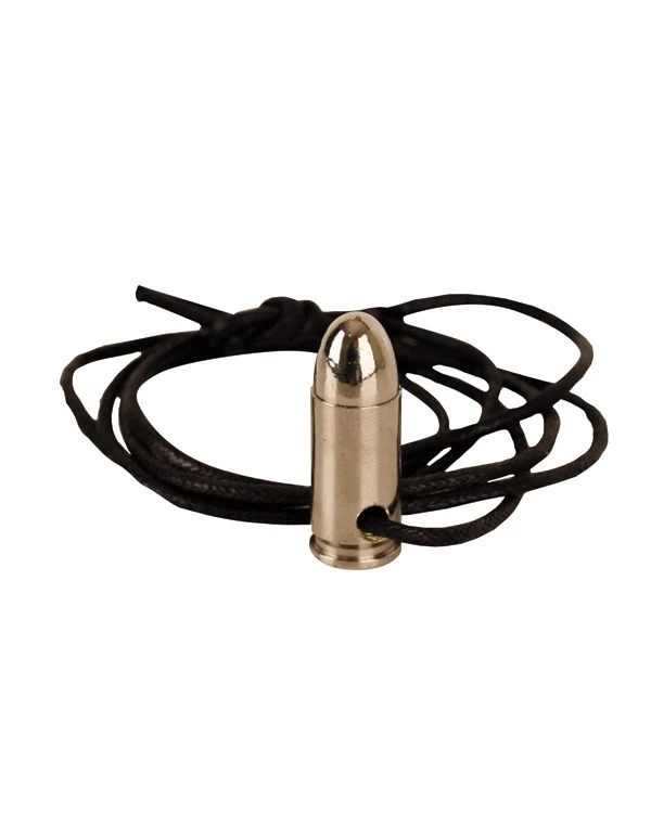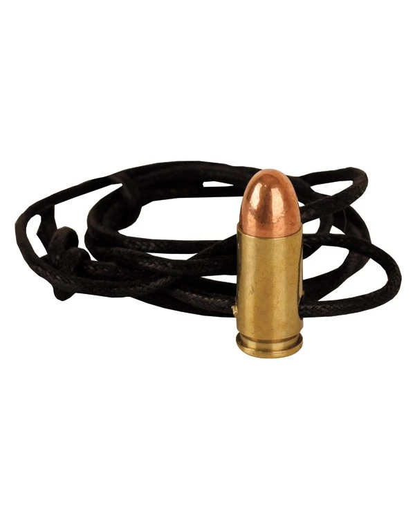 Replica 9mm Bullet threaded on a leather necklace. Available in Silver and Brass finishes.