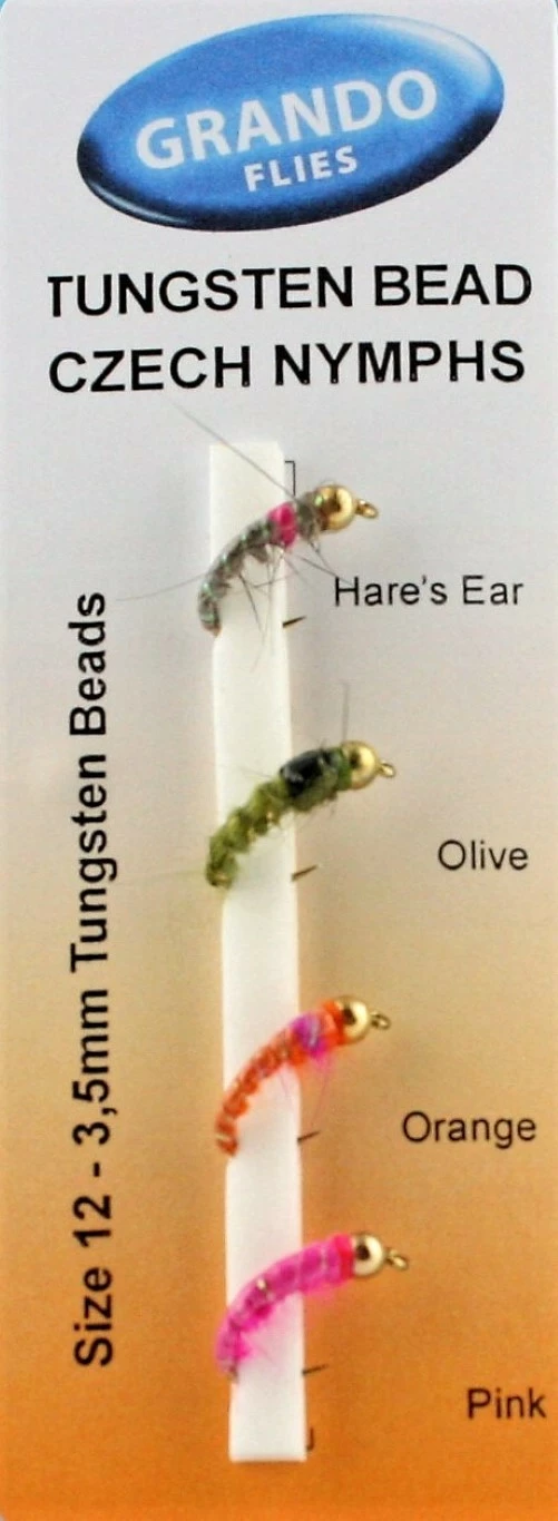 The Tungsten Bead Czech Nymph Flies from Grando Flies is a selection of 4 different coloured Czech Nymph Flies: Hares Ear, Olive, Orange and Pink. These flies are excellent for rivers, streams and of course, Stillwater venues.