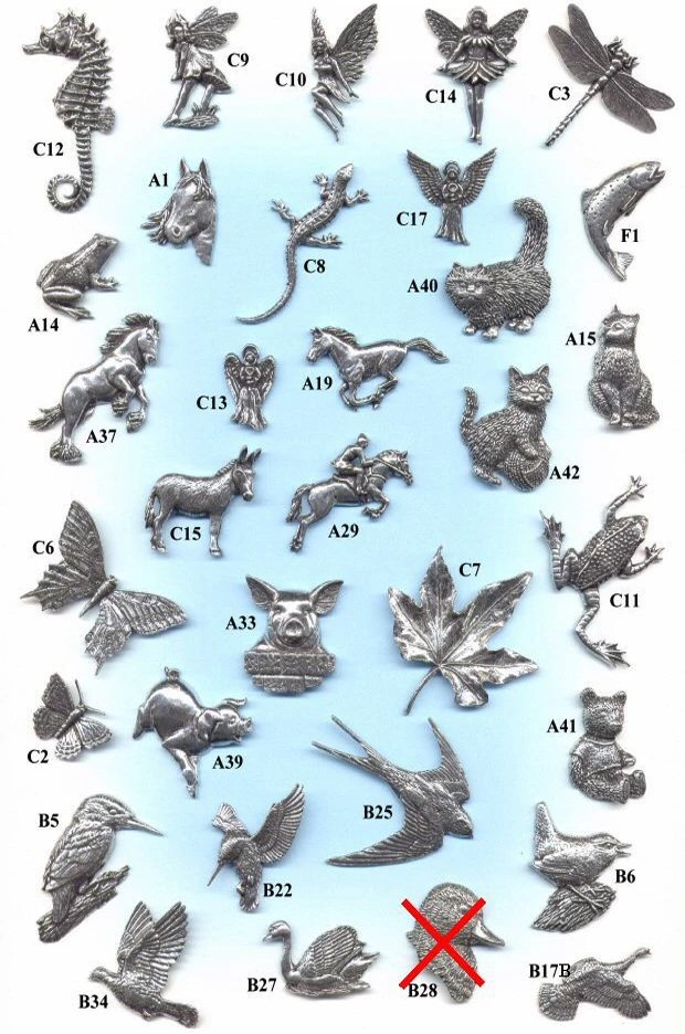 A range of Pewter Pins from A R Brown. Pins in the images with a red cross over them are unavailable.