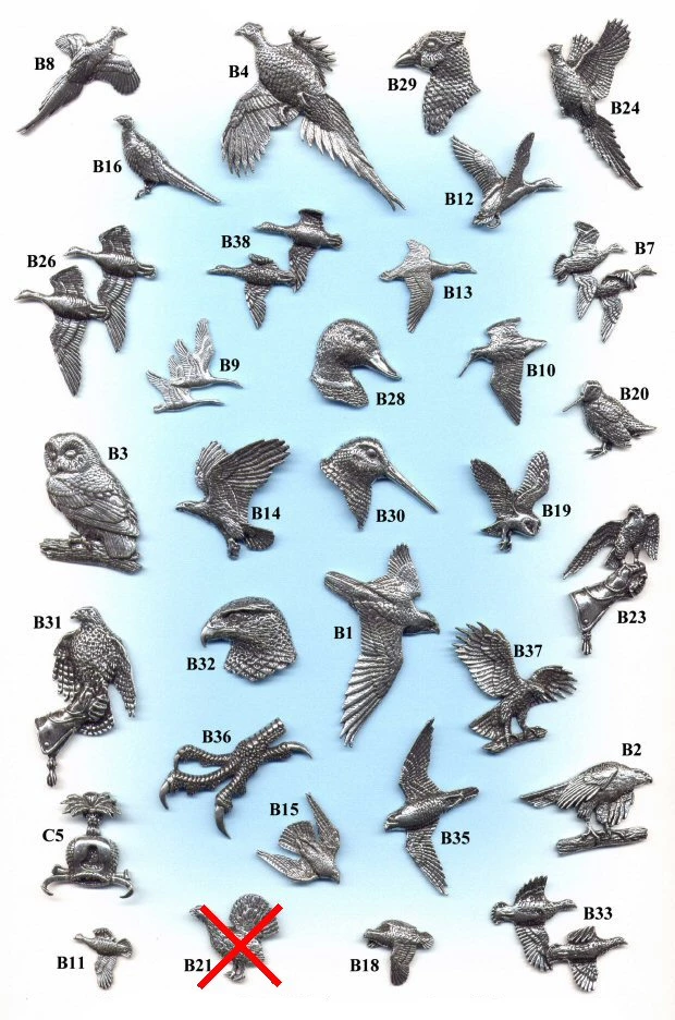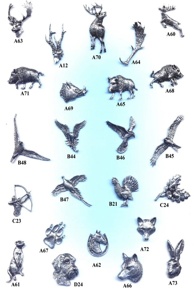| Option | Falcon 2, Rising Woodcock, pair of Ducks, Woodcock's Head, Pheasant's Head, Single Mallard, Rising Mallard, Grouse, Woodcock, Large Pheasant, Stag 2, Red Stag Antler, Red Stag Head, Roebuck, Stag 1, Spaniel & Pheasant, Labrador & Duck, Sm Spaniel's Head, Sm Labrador's Head, Stag's Head, Roe Trophy, Small Fox Head, Roe Deer, Fox Head 1, Horse's Head |