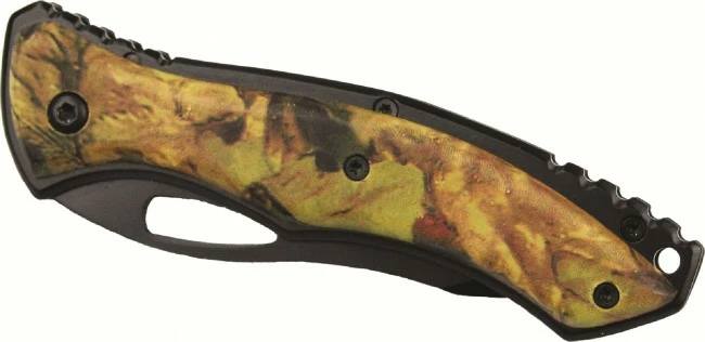 A folding camouflage bushcraft 8cm blade knife.