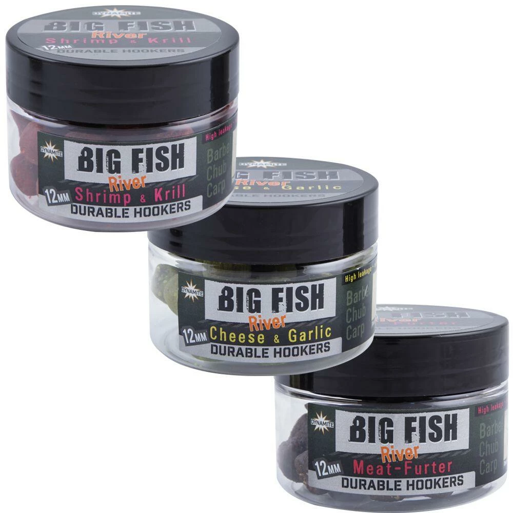 Dynamite Baits Big Fish River Durable Hookbaits, These durable hookbaits are 12mm in size with high leakage designed for rivers either hooked directly or hair rigged. Available in three flavours: Cheese & Garlic, Meat-Furter and Shrimp & Krill.