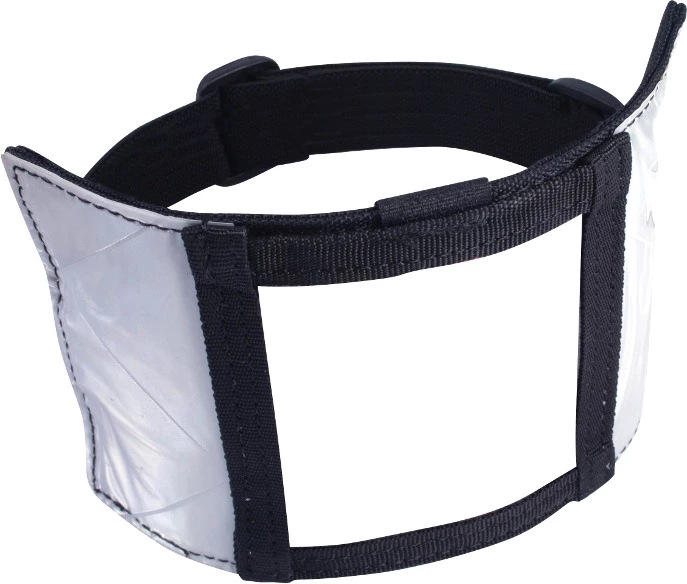 Id armband that has an adjustable strap and features two reflective patches for visiablity.