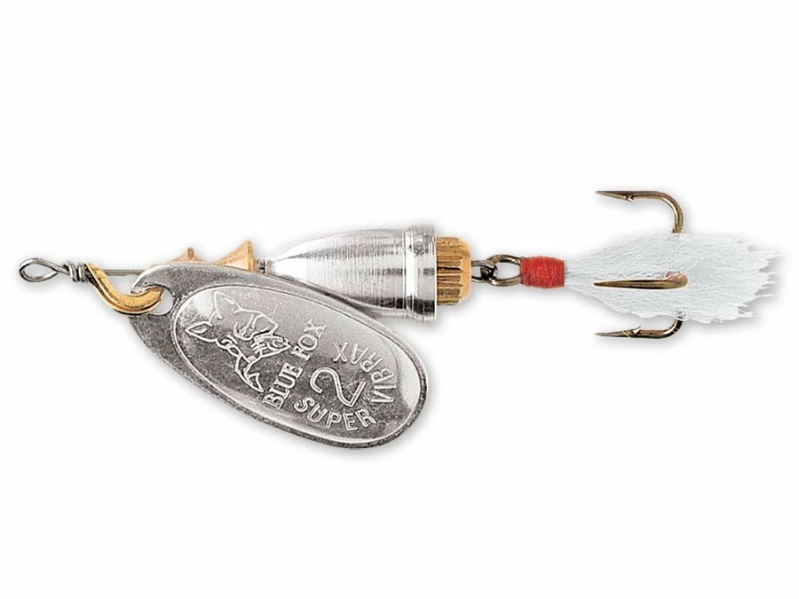 Runs 2 feet to 6 feet. The patented two-part body emits low-frequency sound vibrations that attract fish and trigger strikes while virtually eliminating line twist. The Classic Vibrax® gets a tasty candyback! Colored bell is accented with metallic flecks. Blade is tipped in matching color, while blade back is finished with transparent, fluorescent coordinating color. Flaw-free silver plating, fine tolerances and super-sharp hooks are long-standing features of this low frequency emitting patented two-part body spinner. Spinners Blue Fox Vibrax Foxtail: Patented 2 part body made of machined brass Silver or copper plated Painted, printed and UV Bright finishes Body emits sonic vibration when free turning gear rubs against the Vibrax® bell Brass stamped blades Stainless steel shaft VMC® Hook is extremely sharp for quick penetration and perfectly tempered for strength Sizes 3-6 include proper size siwash.