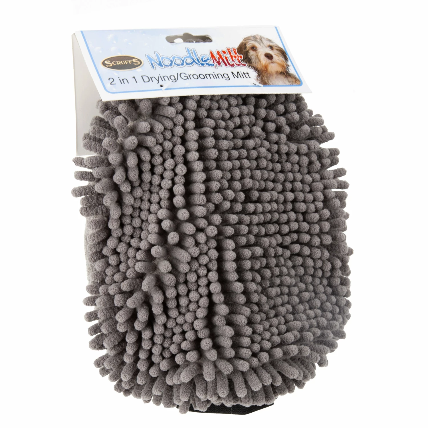 Scruffs Noodle Drying Mitt is very absorbent, sucking up extra moisture rapidly and allowing your dog’s coat to dry quickly after a muddy walk. The ‘noodles’ of the dry mitts are made of micro-fibre chenille. The micro-fibre material is made up of millions of rough, ultrafine strands that have been braided together to provide a surface area far larger than the dry mitt’s actual size. This large surface area provides the dry mitt its super-absorbent capabilities, allowing it to soak up water like a sponge while also boosting airflow, reducing drying time. This item is machine washable.