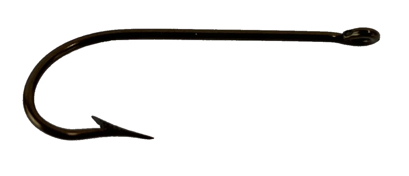Bronzed Kirby hook, best spring steel, uniform temper, filed points, ringed.